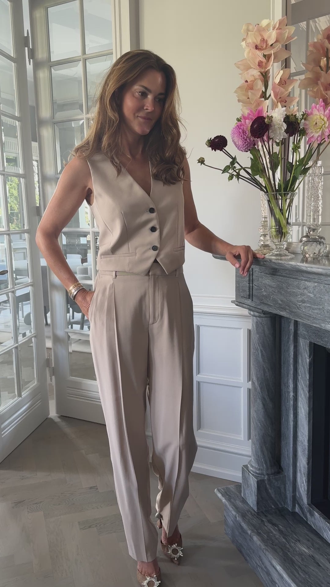 Klassisk lige buks med linning, læg, bæltestropper skrålommer , gylp og paspolerede baglommer.