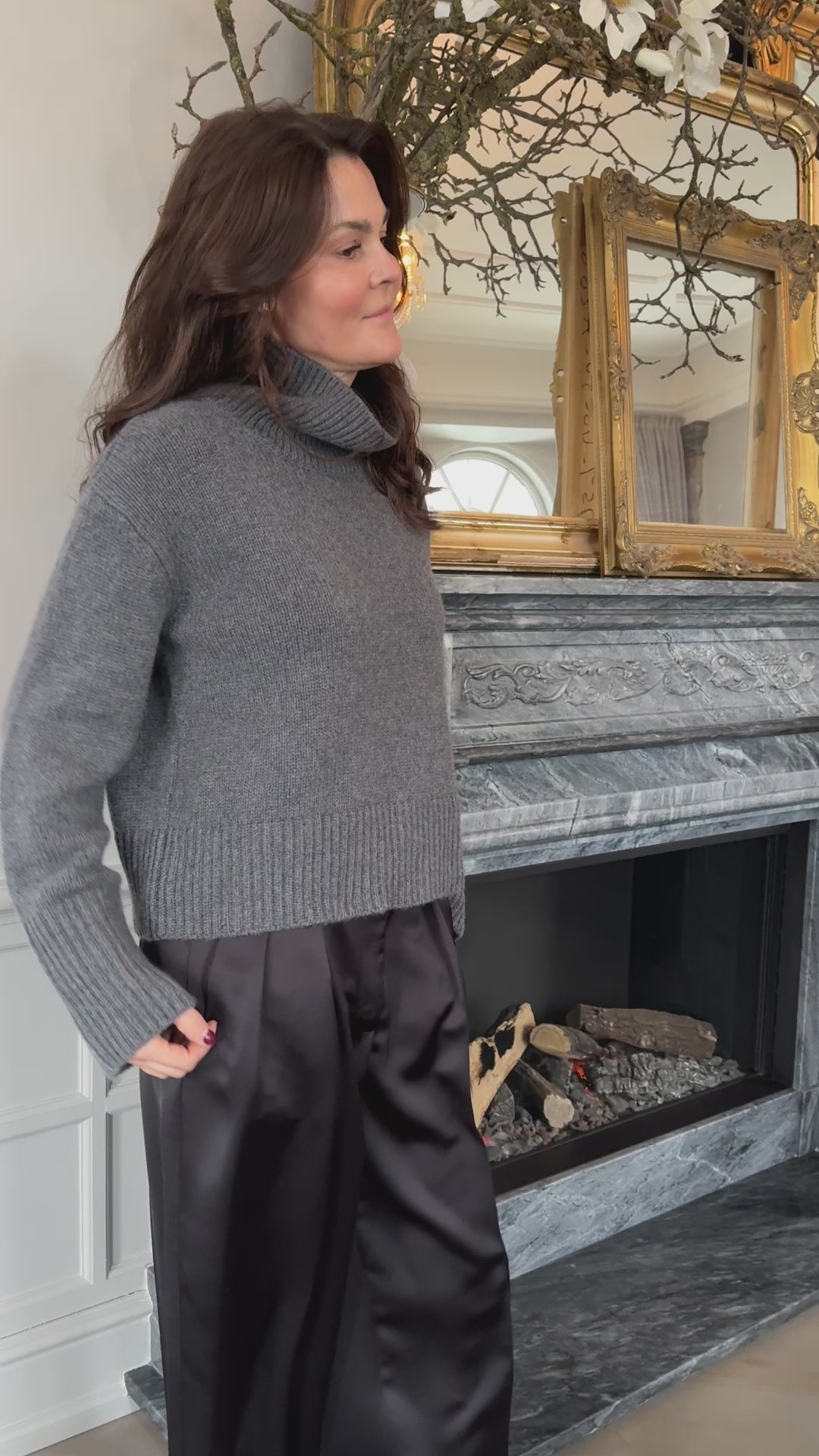 Strikken er en af de super populære modeller med den flatterende høje hals og lange ærmer. Den er i en mørk grå og meget flot til et par skindbukser, jeans eller nederdel.