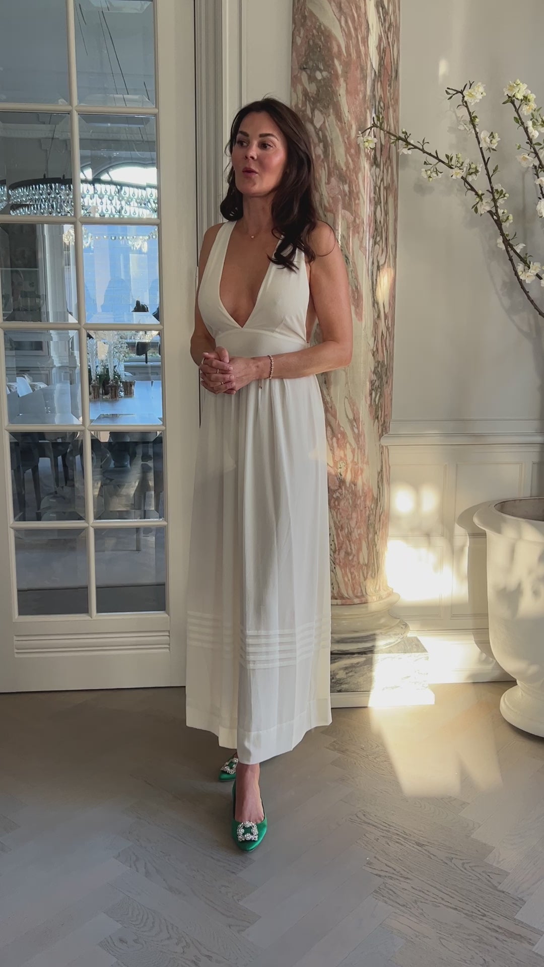 Kjolen har en høj talje og et langt skørt. Den har en dyb v udskæring og åben ryg